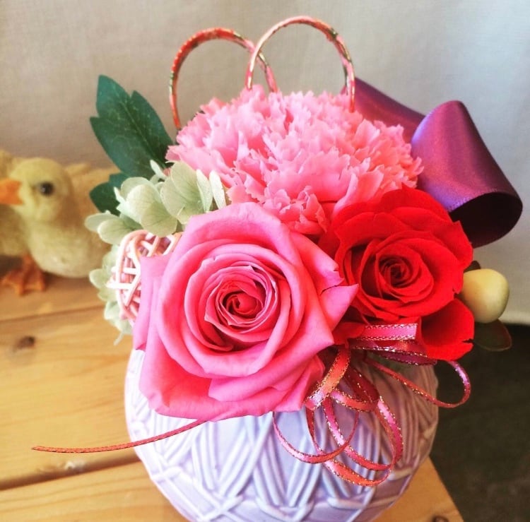 まあるいコロンとした陶器に、プリザーブドフラワーのバラとカーネーションをアレンジしました。 母の日、お誕生日、記念日などに人気商品です。 少し和風テイストの、可愛らしいフラワーアレンジメントです。 横15cm縦20cm奥行き15cm
