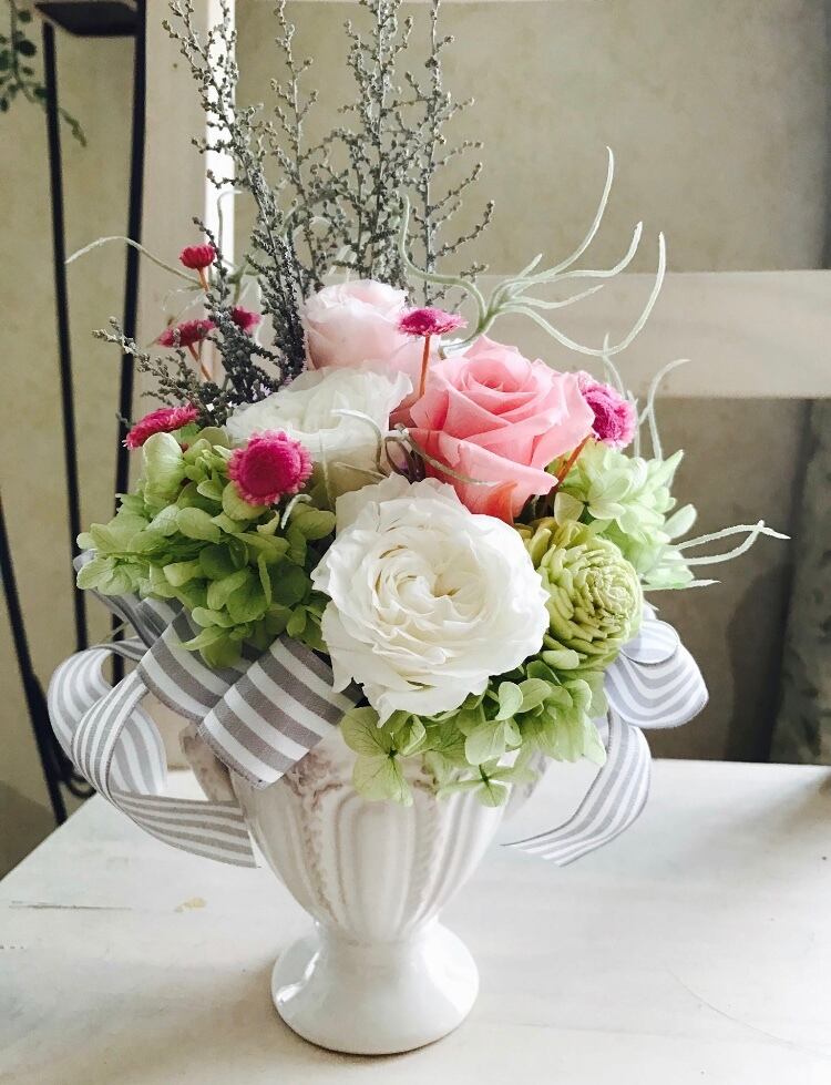 淡い色合いのプリザーブドフラワーです。 お誕生日、結婚祝い、結婚記念日など各種お祝いにも最適です。 大きさは幅15cm、高さ20cm、奥行き15cmです。