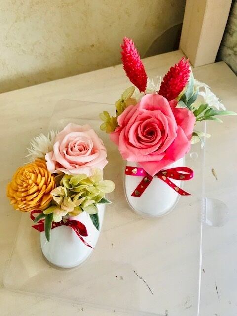 レジンの素材のベビー靴の型に、プリザーブドフラワーをアレンジしました。 赤ちゃんの可愛いお顔が想像できますね! 出産祝いに!生まれてきてくれたお喜びの記念に! 大きさは靴の大きさが約6cm 箱の大きさは約12×12×10㎝