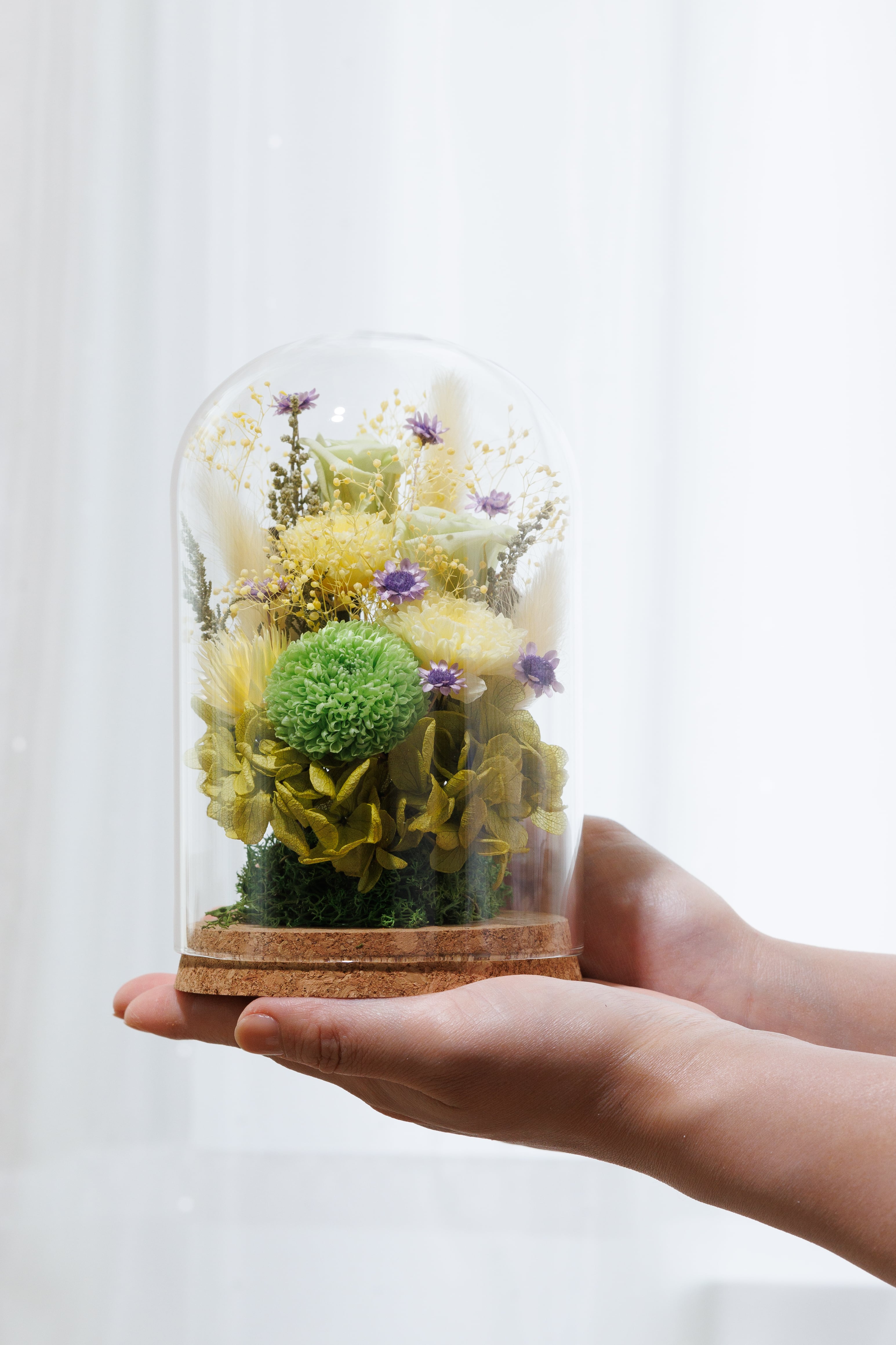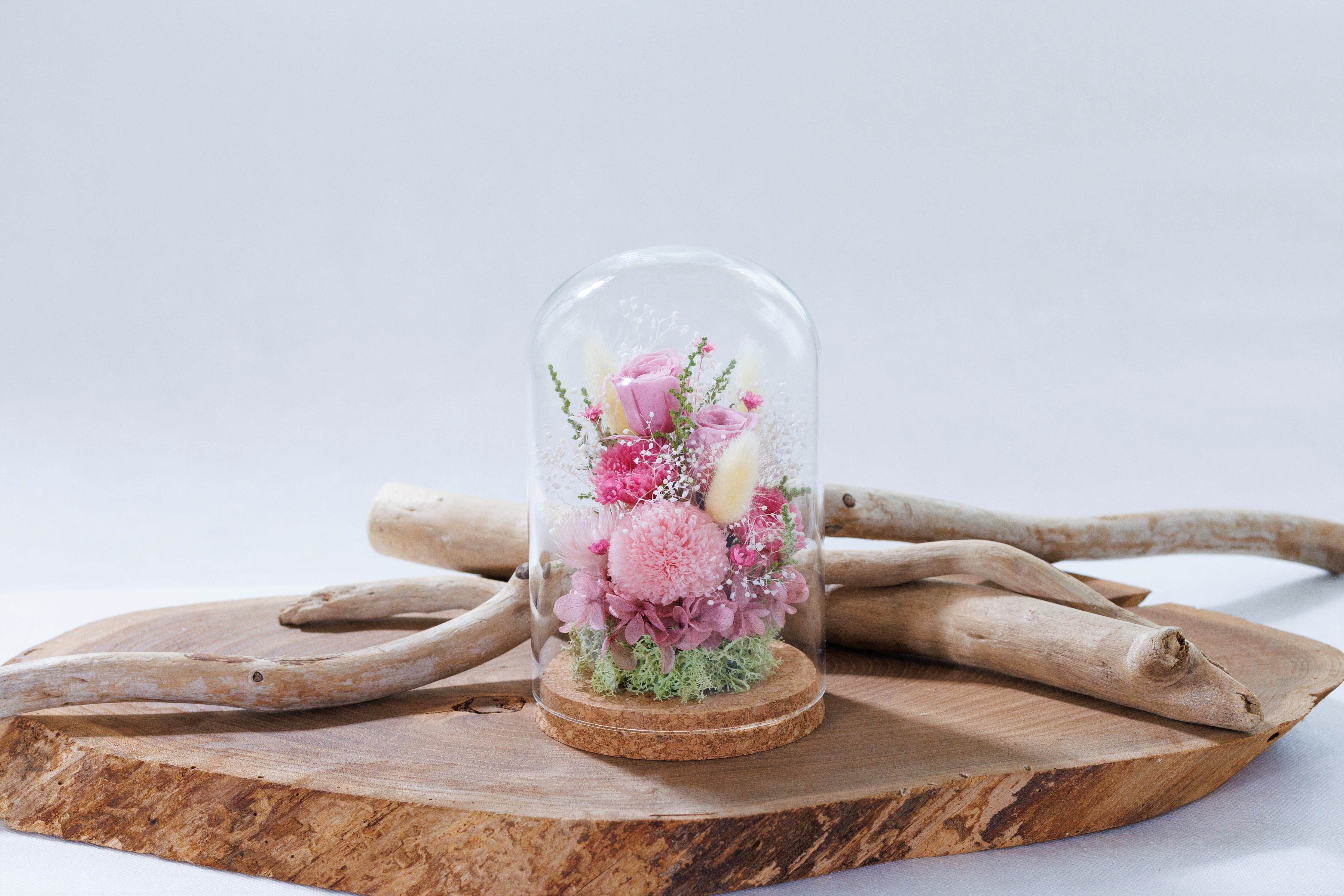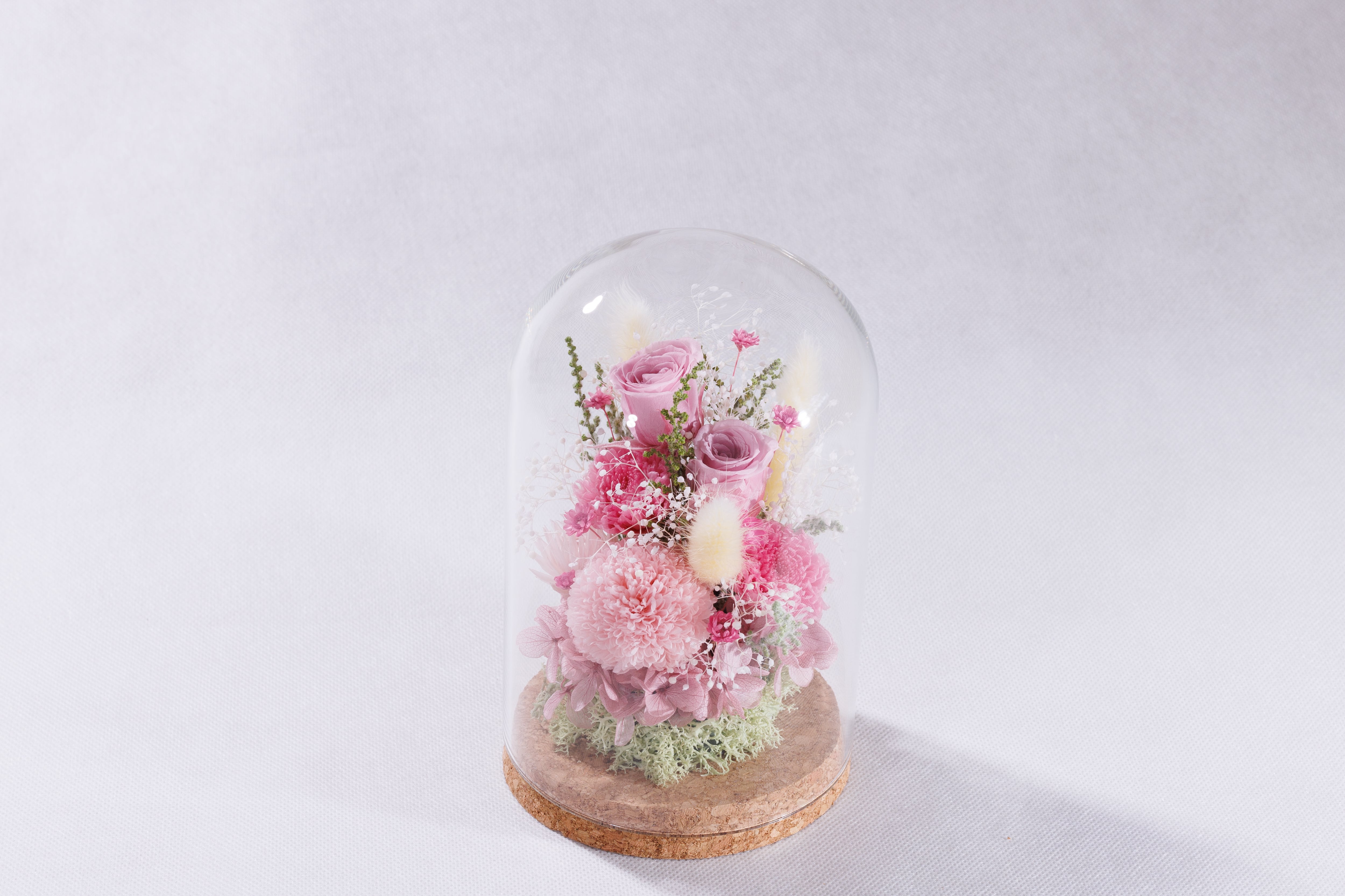 プリザーブドフラワーは、湿気やほこりに弱いのでガラスドームの中ですと安心です。