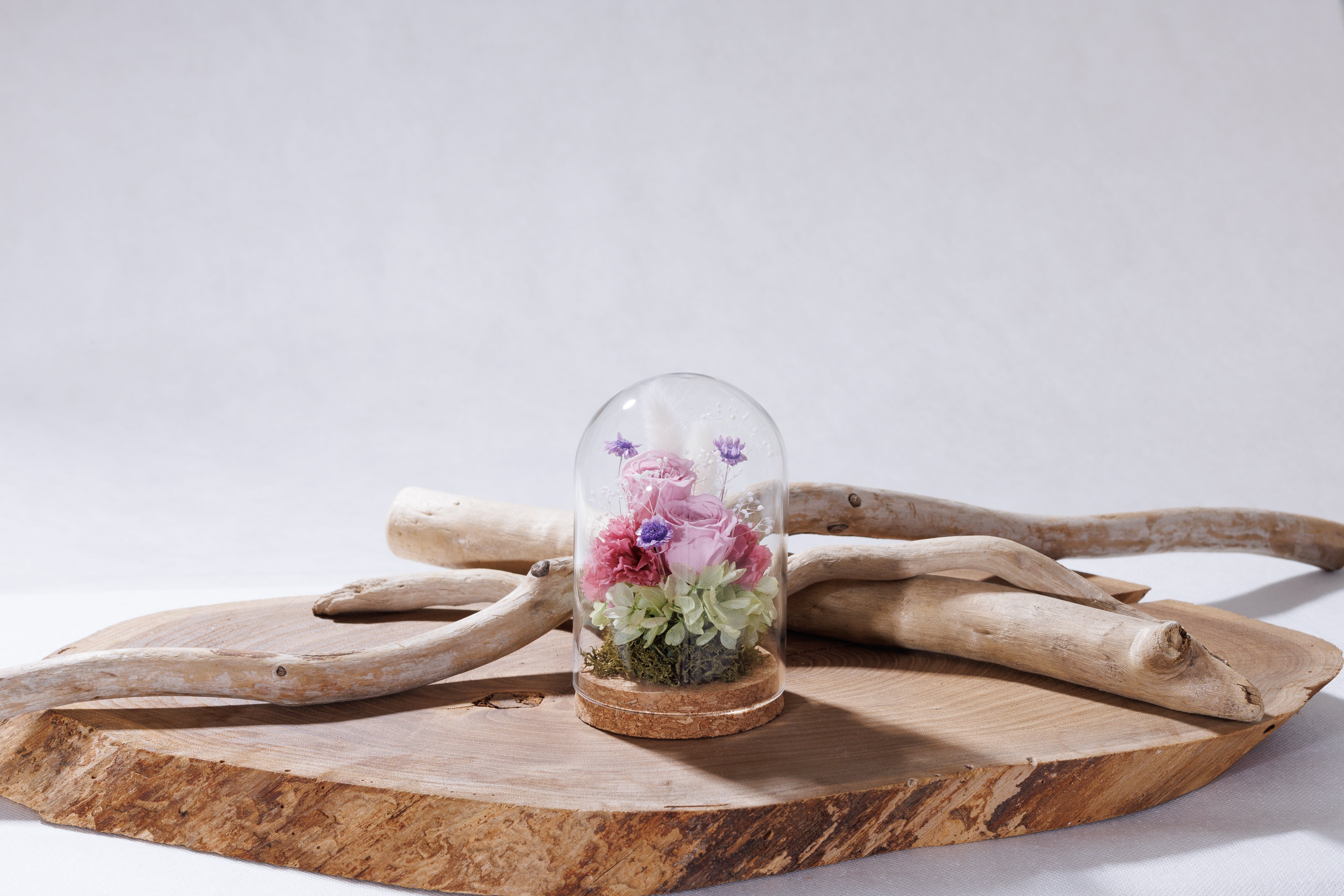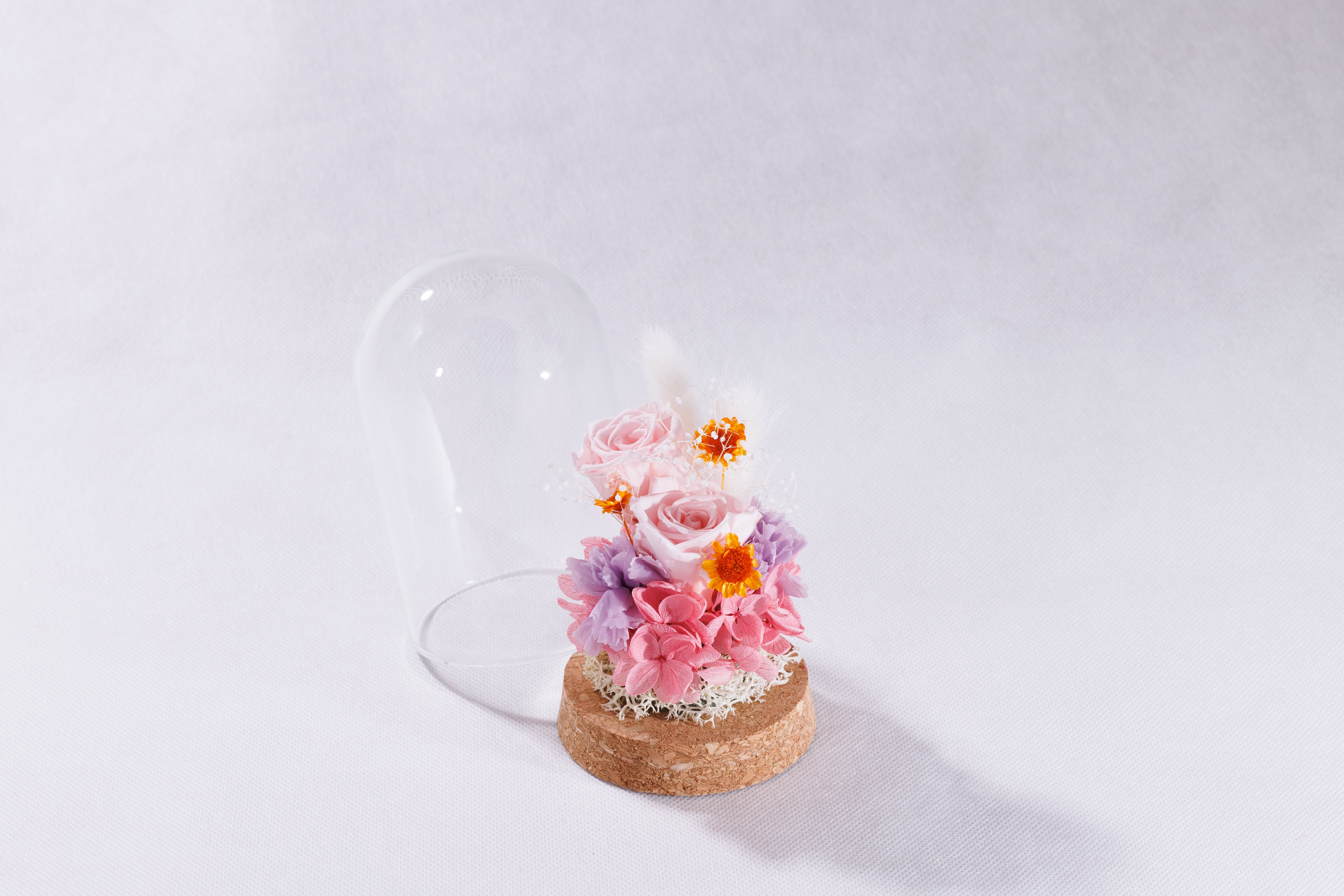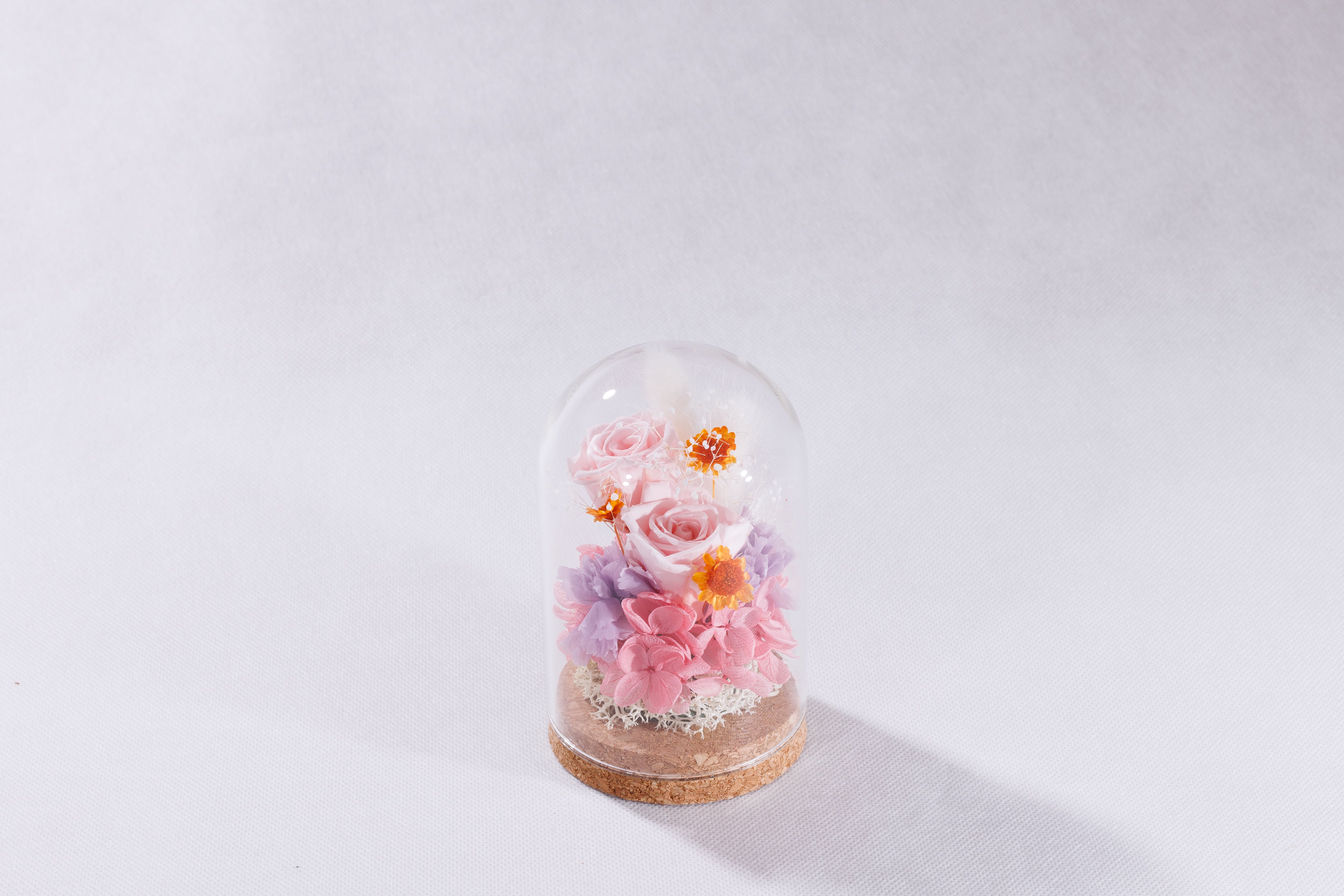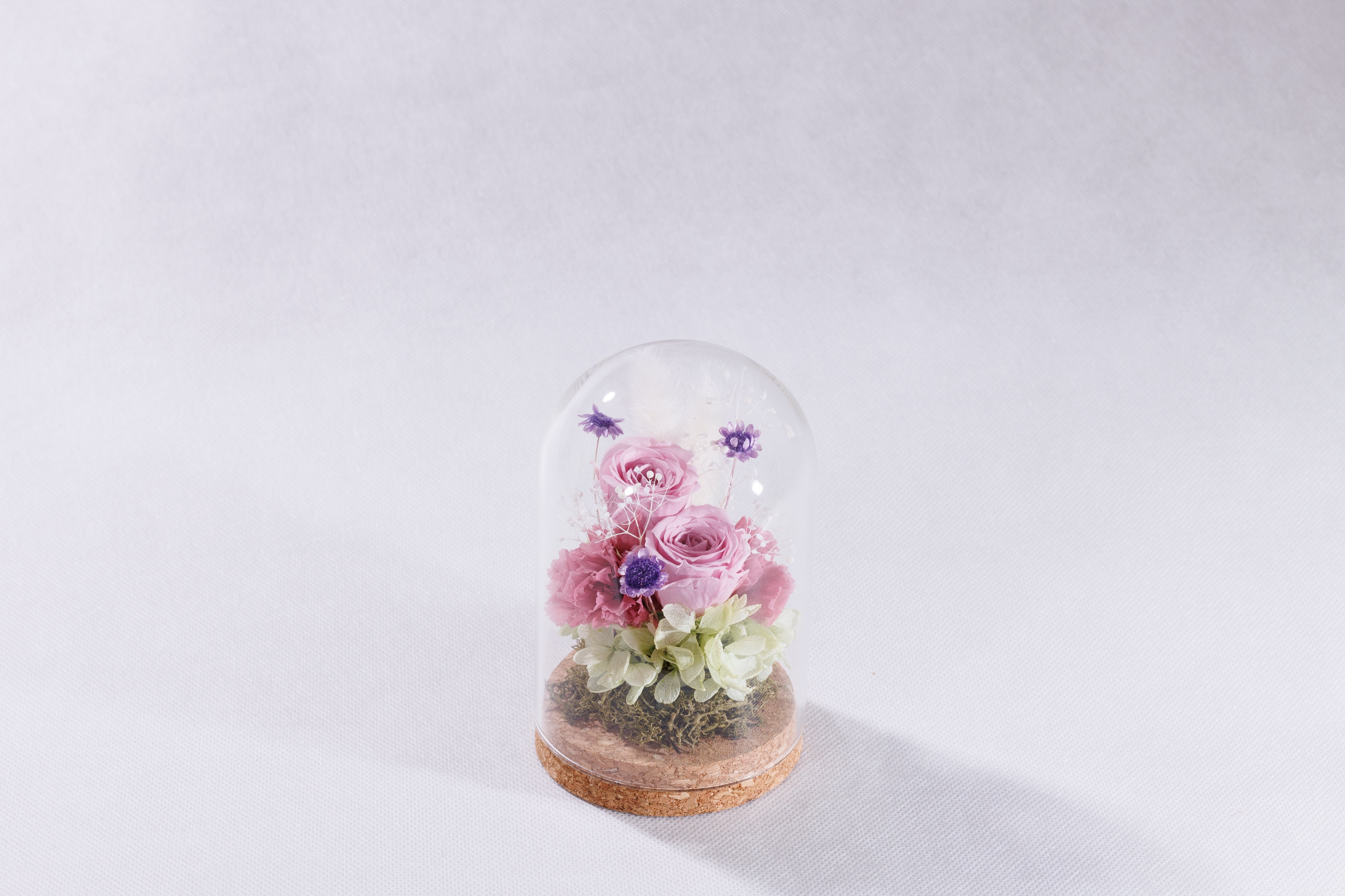 ガラスドームの中に、バラ・カーネーション・あじさい・小花を詰め込みました。