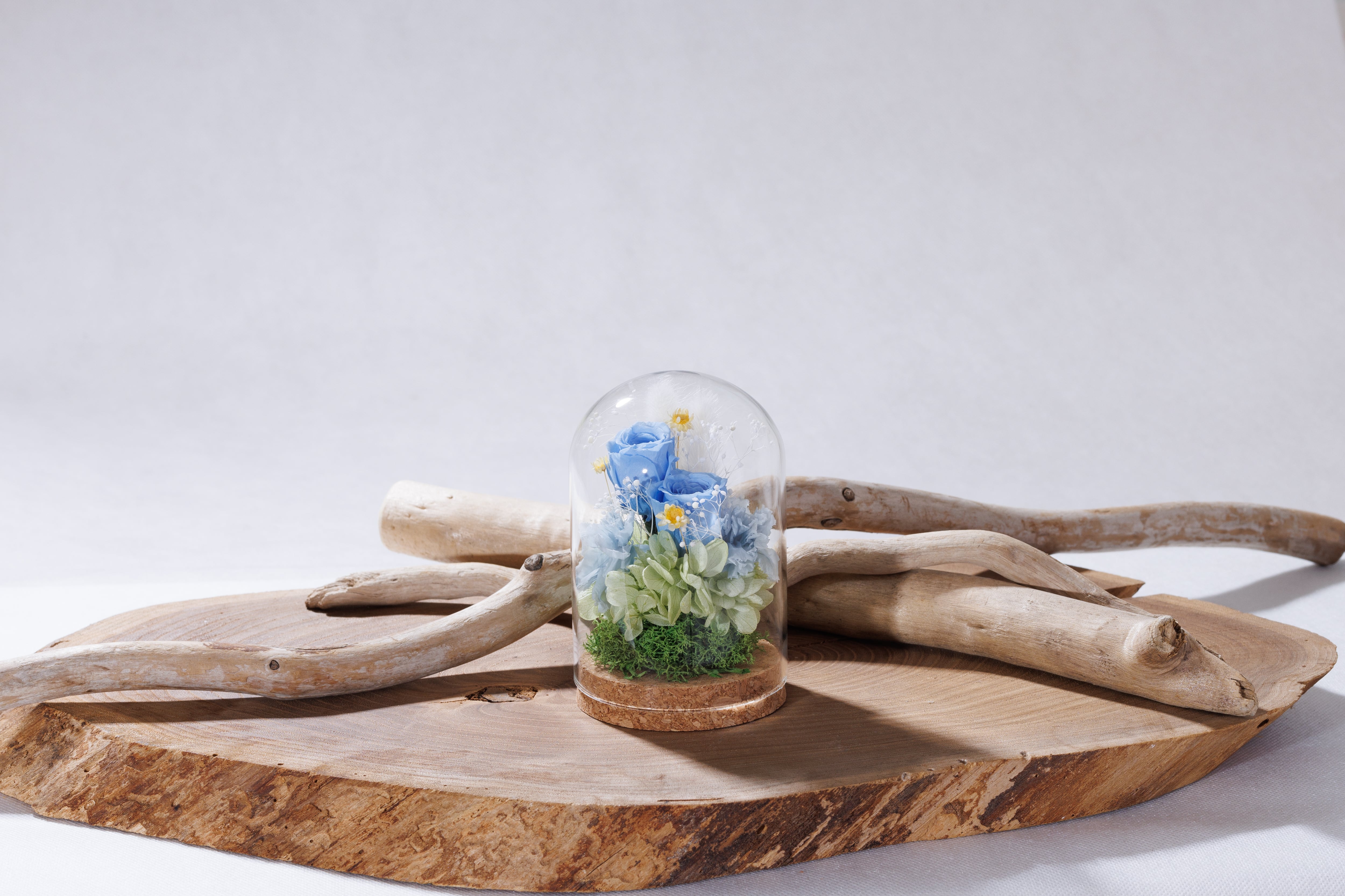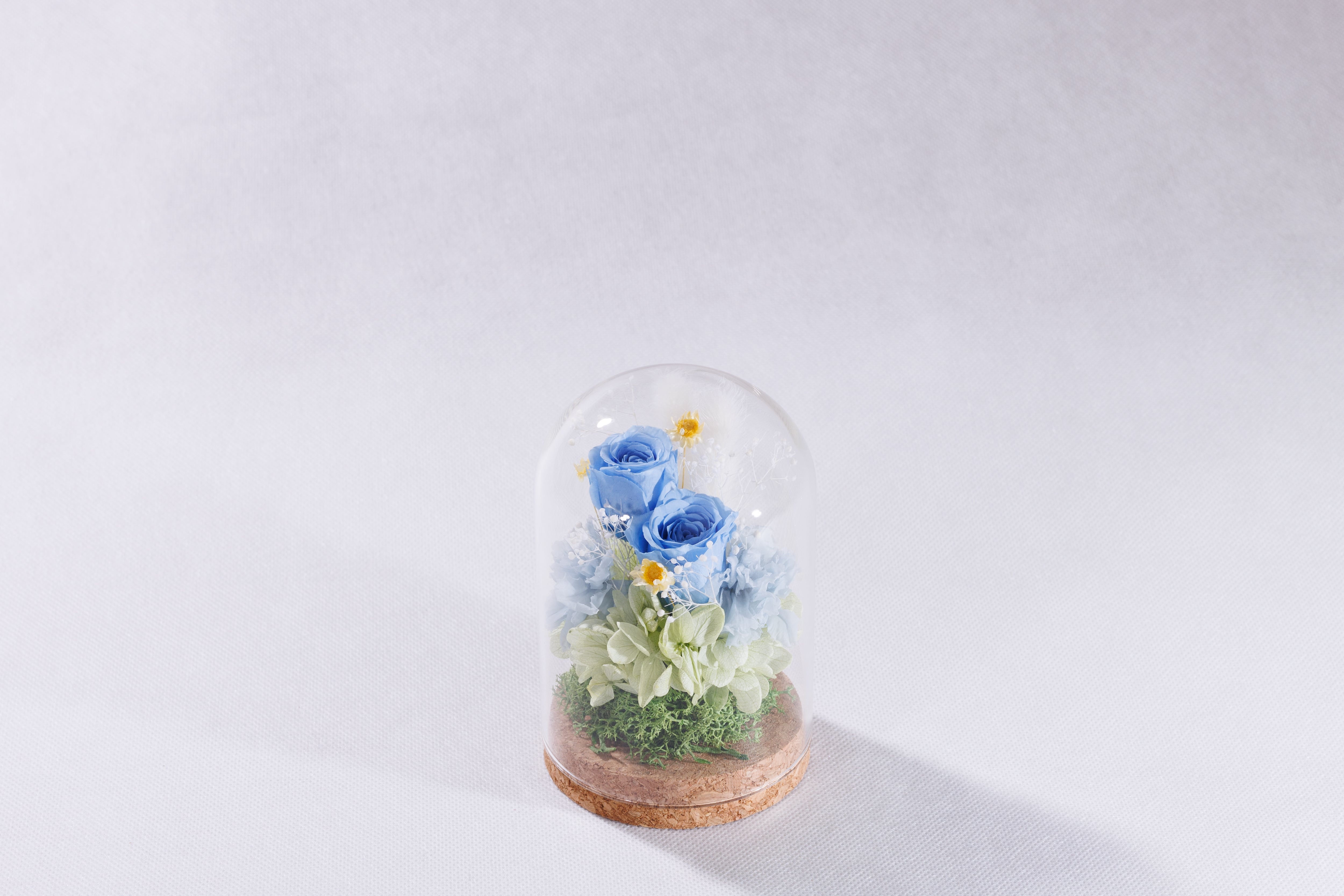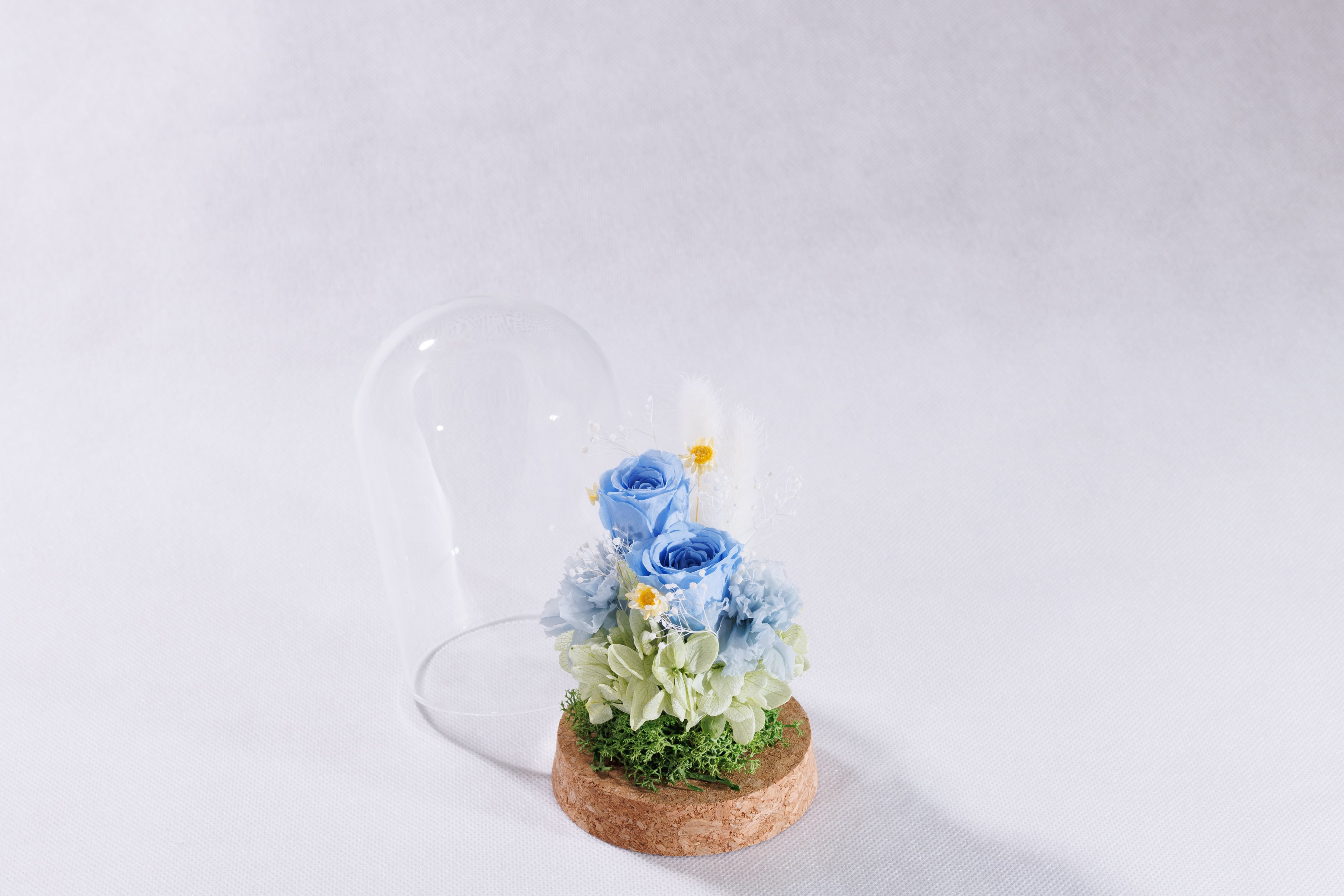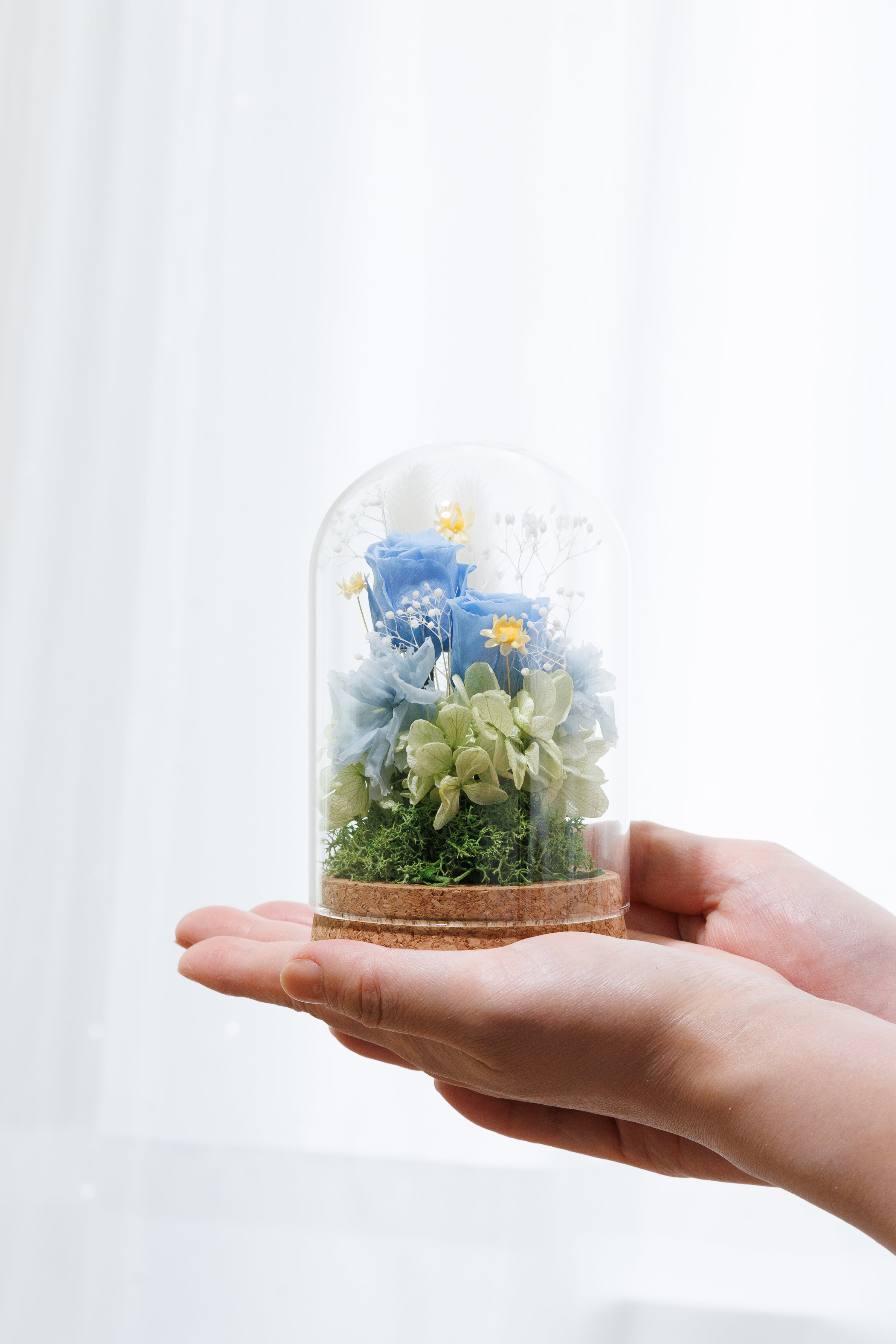 ガラスドームの中に、バラ・カーネーション・あじさい・小花を詰め込みました。