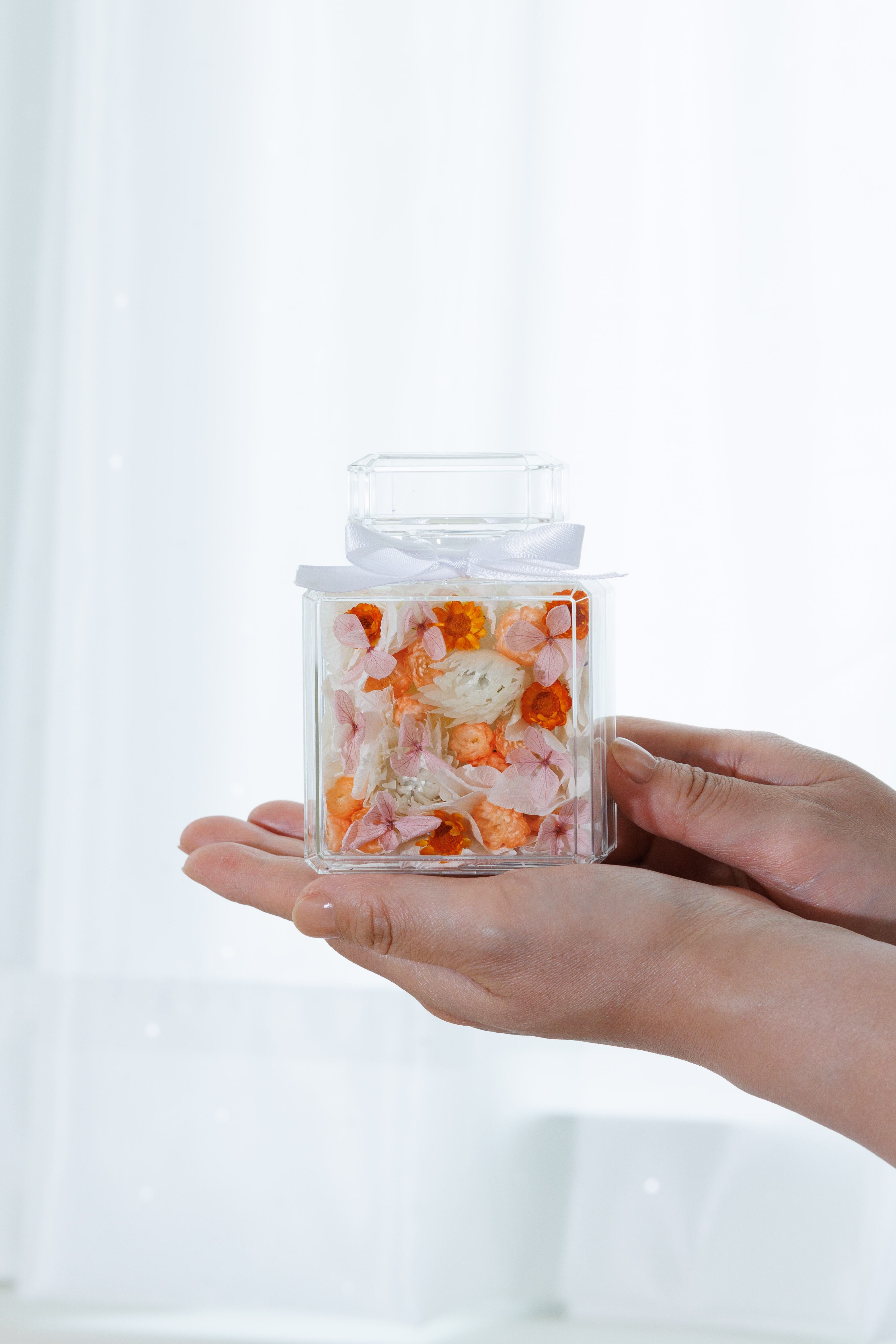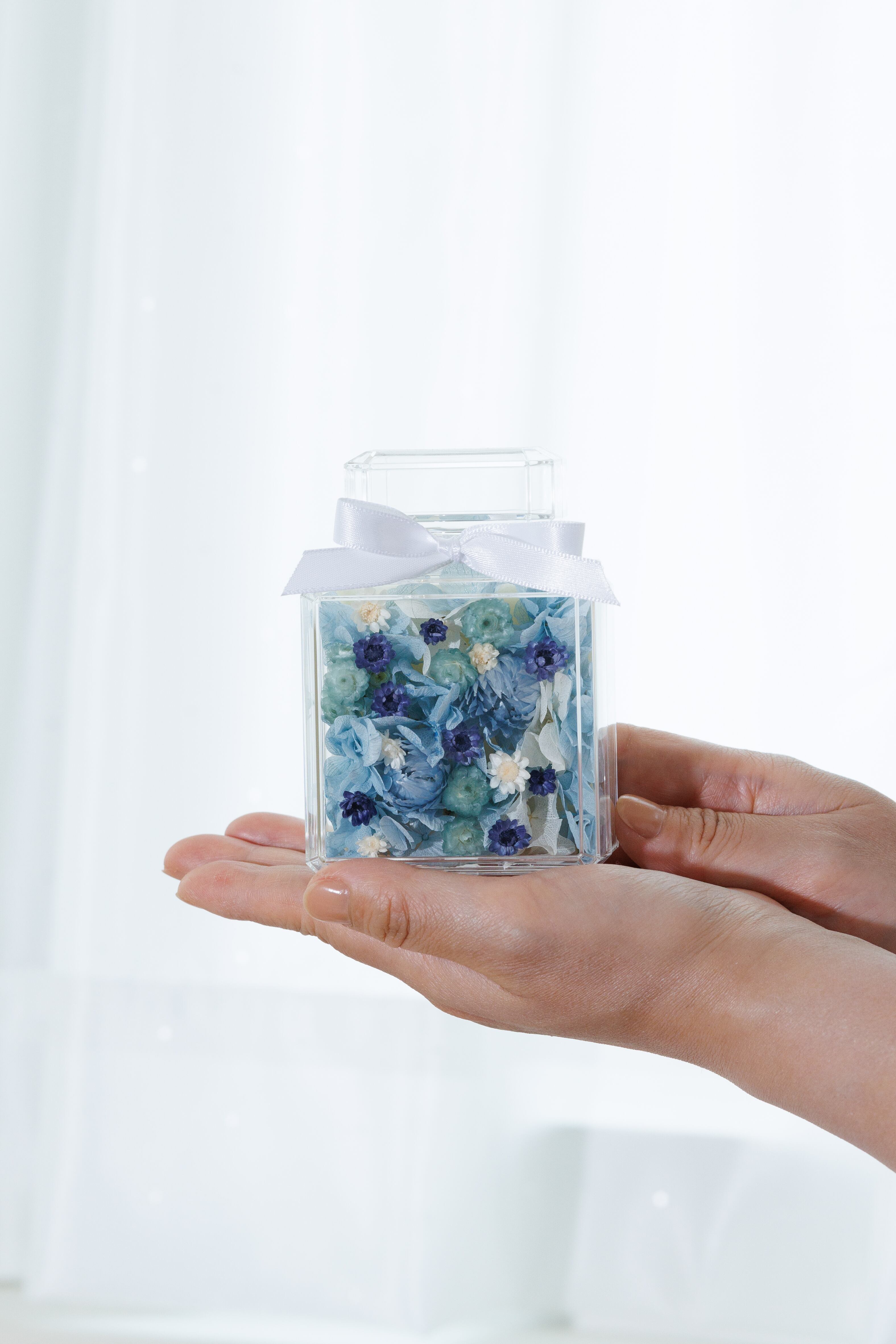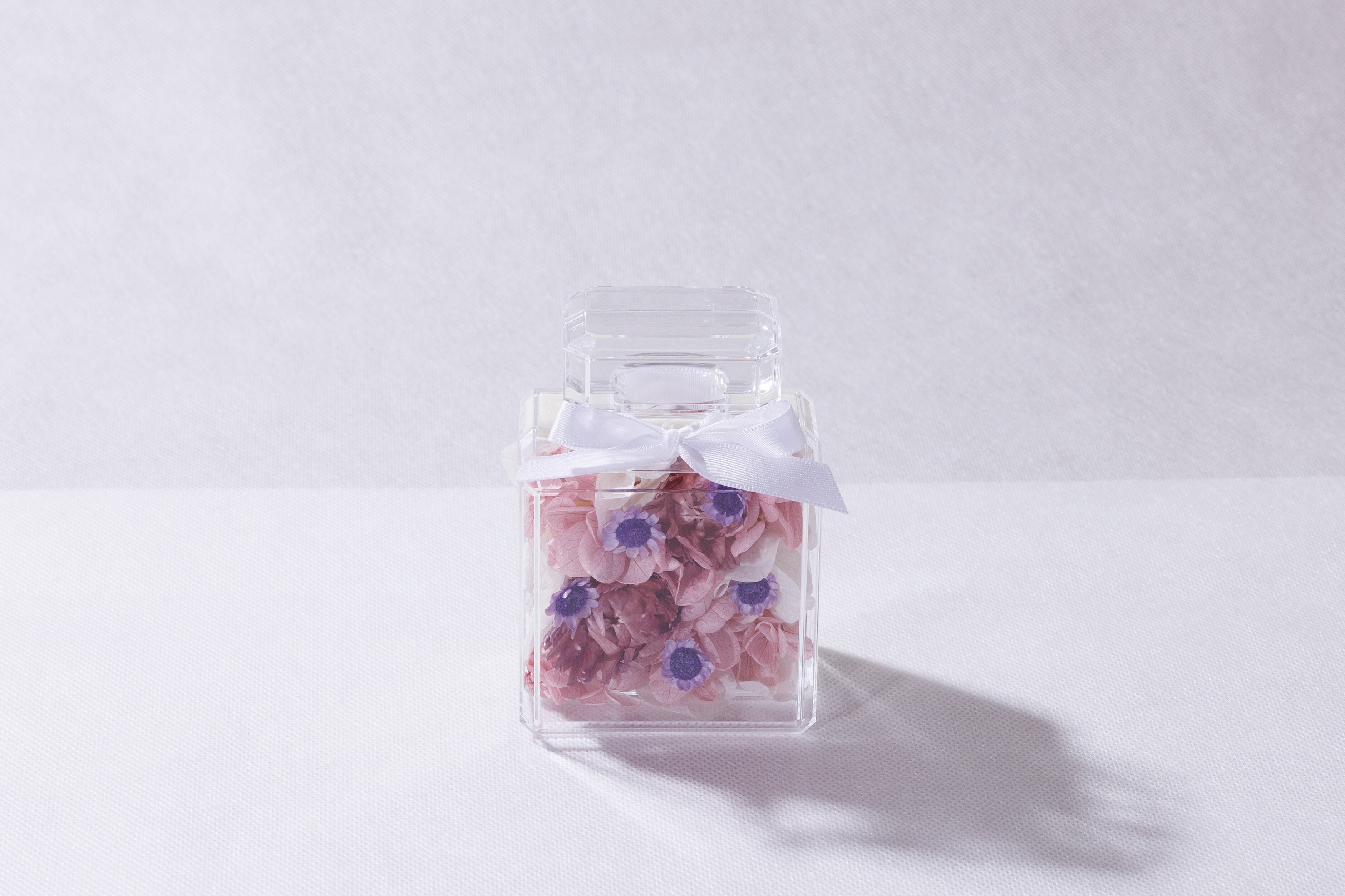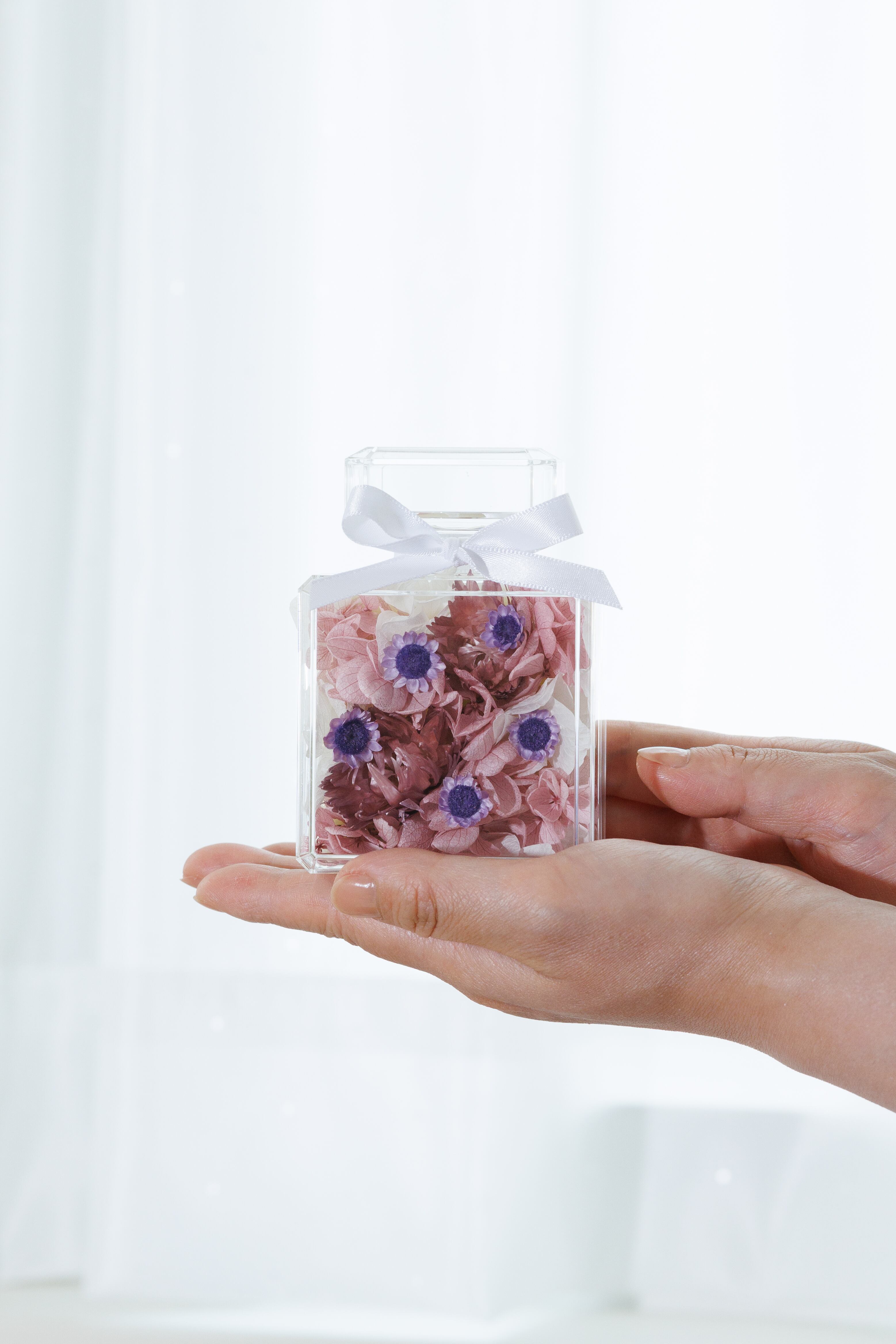 香水ボトルを形どったプラスチックボトルに、 プリザーブドフラワーを敷き詰めました。 お家のどこに置いてもキュートです。 色は3色! 紫系 ブルー系 ピンク系 大きさは、巾約7㎝ 高さ約10cm 奥行き約5㎝